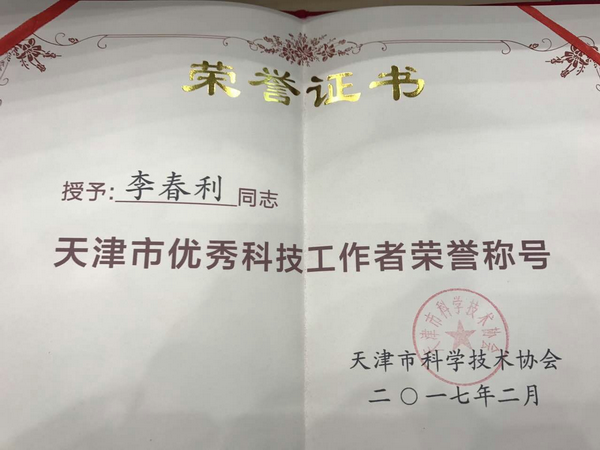 天津市優(yōu)秀科技工作者榮譽(yù)證書